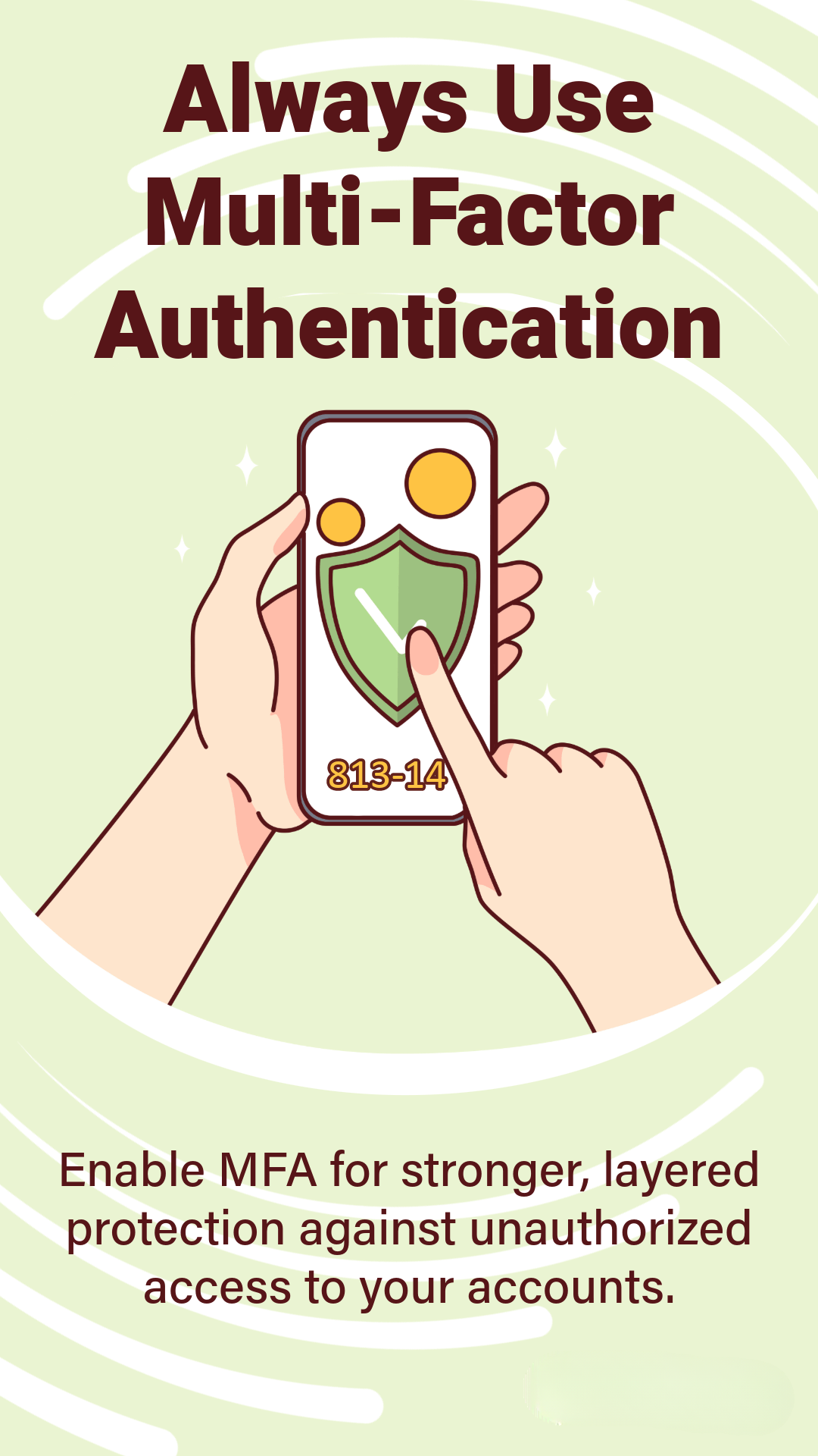 Add an extra layer of security with Multi-Factor Authentication (MFA). Even if a password is compromised, MFA keeps your accounts secure by requiring additional verification.